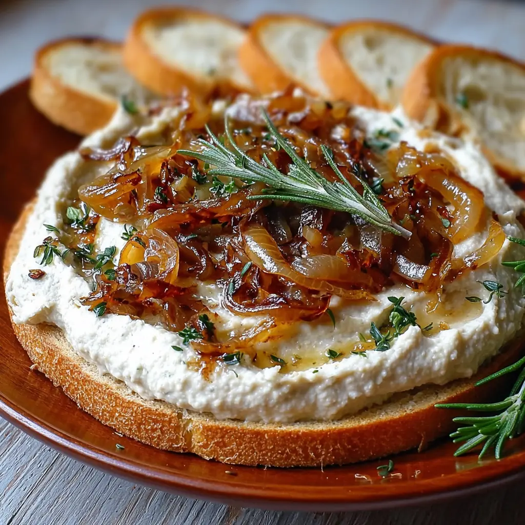 A creamy and flavorful spread made with white beans, caramelized onions, and rosemary, perfect for appetizers or snacks.